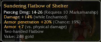 sundering flatbow of sheltering req 10 marksmanship, +14% dmg, armor penetration +20%-19% chance, armor +7 vs phy dmg (gold)