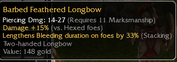 barbed feathered longbow req 11 marksmanship, +15% bleed duration +33% (gold)